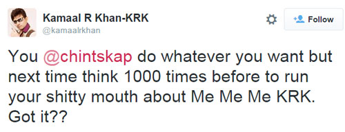 वैसे दोनों ही कई बार अपने ट्वीट्स को लेकर विवादों में घिर चुके हैं। खास ताैर से केआरके तो अभद्र भाषा का इस्तेमाल करते हुए कई बॉलीवुड सितारों को निशाना बना चुके हैं। हाल ही में अनुराग कश्यप पर काफी भद्दी टिप्पणियां की थी।