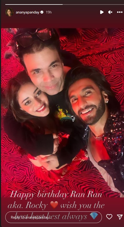 तस्वीर में अनन्या पांडे, रणवीर सिंह और करण जौहर के साथ पोज करते हुए नजर आईं। रणवीर सिंह को विश करते हुए पोस्ट के साथ अनन्या ने कैप्शन में लिखा, हैप्पी बर्थडे रन रन उर्फ रॉकी, तुम्हें हमेशा शुभकामनाएं दूंगी।"