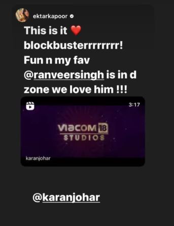 फिल्म और टीवी प्रोड्यूसर एकता कपूर ने 'रॉकी और रानी की प्रेम कहानी' (Rocky Aur Rani Kii Prem Kahaani) का ट्रेलर देख इस फिल्म को ब्लॉकबस्टर बताया है। उन्होंने इंस्टाग्राम स्टोरी पर ट्रेलर पोस्ट करते हुए कहा, "बस यह ब्लॉकबस्टर है। फन और मेरे फेवरेट रणवीर सिंह उस जोन में है, जिसे हम पसंद करते हैं।"