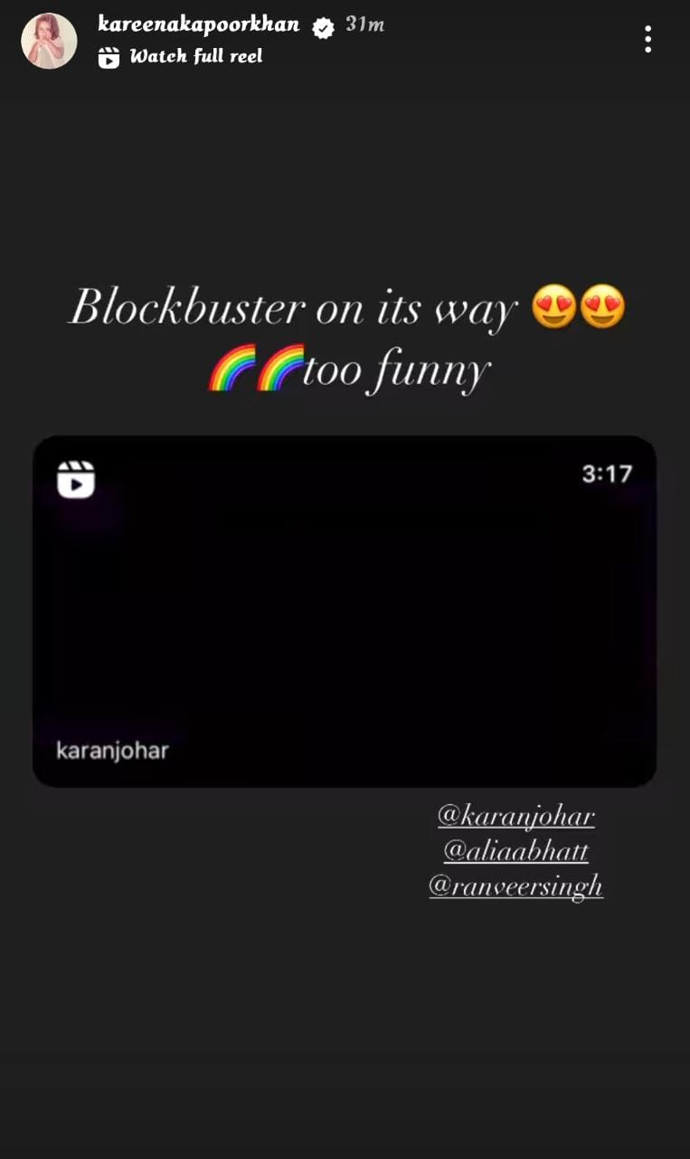 करीना कपूर ने अपनी भाभी आलिया भट्ट और रणवीर सिंह की फिल्म का ट्रेलर पसंद किया। उन्होंने इंस्टाग्राम स्टोरी पर पोस्ट कर कहा, "ब्लॉकबस्टर आने वाली है। बहुत मजेदार।"