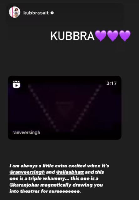 फेमस एक्ट्रेस कुब्रा सैत (Kubra Sait) ने इंस्टाग्राम स्टोरी पर फिल्म के ट्रेलर पर रिएक्शन देते हुए करण जौहर, आलिया और रणवीर की तारीफ की है। कुब्रा ने लिखा, "जब बात आलिया और रणवीर की आती है तो मैं थोड़ा ज्यादा एक्साइटेड हो जाती हूं और इसमें तो तिकड़ी धमाचौकड़ी है। यह करण जौहर हैं, जो आपको मैग्नेटिकली थिएटर्स में खीचेंगे।"