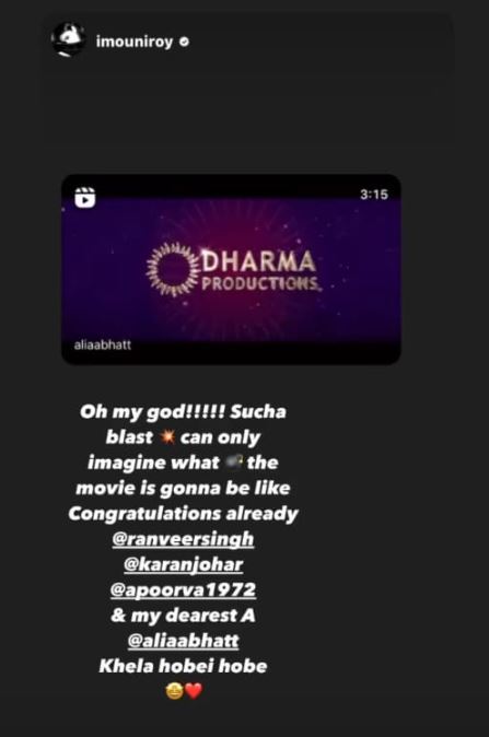 'ब्रह्मास्त्र' एक्ट्रेस मौनी रॉय ने 'रॉकी और रानी की प्रेम कहानी' का ट्रेलर शेयर करते हुए कैप्शन में लिखा, "ओह माय गॉड। धमाकेदार है। बस इमेजिन कर सकती हूं कि मूवी कैसी होगी। पहले से ही बधाई।"