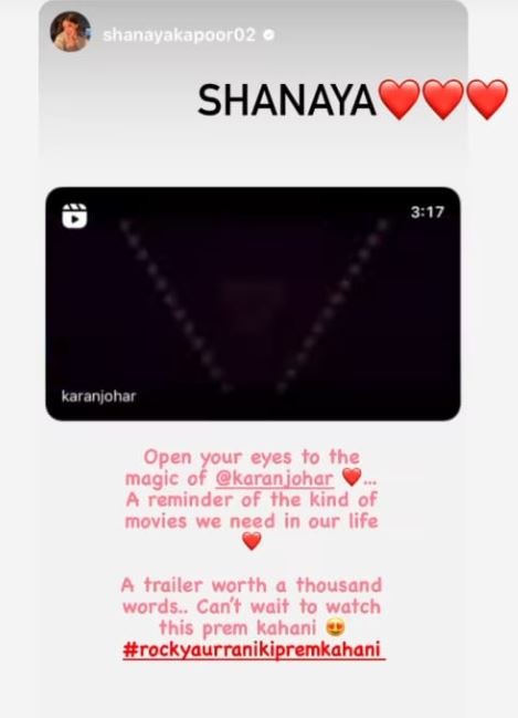 शनाया कपूर ने करण की फिल्म के ट्रेलर को मैजिक बताया। उन्होंने ट्रेलर इंस्टाग्राम अकाउंट पर शेयर करते हुए तारीफ में कहा, "करण जौहर का मैजिक देखने के लिए अपनी आंखे खोलो। यह एक रिमाइंडर है कि हमें इस तरह की मूवीज चाहिए। ट्रेलर एक हजार शब्दों के बराबर है। प्रेम कहानी को देखना का बेसब्री से इंतजार कर रही हूं।"