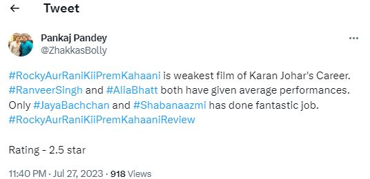 हालांकि एक यूजर को करण जौहर की फिल्म तो पसंद नहीं आई, लेकिन उसमें जया बच्चन की एक्टिंग को उन्होंने जरूर पसंद किया। यूजर ने लिखा, "रॉकी और रानी की प्रेम कहानी करण जौहर के करियर की सबसे वीक फिल्म है। रणवीर और आलिया ने एवरेज परफॉर्मेंस दिया है। सिर्फ जया बच्चन और शबाना आजमी ने अच्छा काम किया है"।