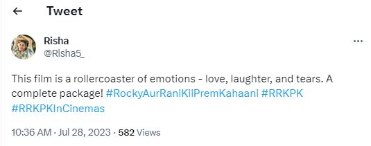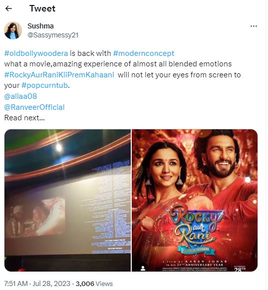 अन्य यूजर ने लिखा, "मॉडर्न कांसेप्ट के साथ बॉलीवुड का पुराना एरा वापिस आ गया है। क्या शानदार मूवी है, फिल्म को देखकर मेरी भावनाएं उमड़ पड़ी थीं। रॉकी और रानी की प्रेम कहानी आपकी आंखों को स्क्रीन से हटने नहीं देगी"।