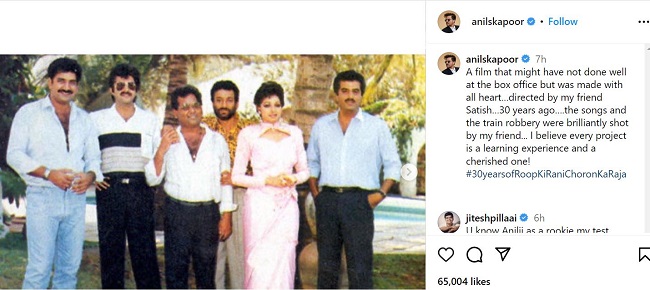 फोटो शेयर करते हुए अनिल कपूर ने लिखा है, 'इस फिल्म ने भले ही बॉक्स ऑफिस पर अच्छा प्रदर्शन नहीं किया हो लेकिन यह फिल्म पूरे दिल से बनाई गई थी। इसका निर्देशन मेरे दोस्त सतीश ने किया था। 30 साल पहले गाने, ट्रेन रॉबरी सब कुछ बहुत अच्छे से शूट किया गया था। मुझे लगता है, यह एक शानदार अनुभव था। इसे मैं हमेशा संजोकर रखूंगा। रूप की रानी चोरों का राजा के 30 वर्ष पूरे हुए।'
