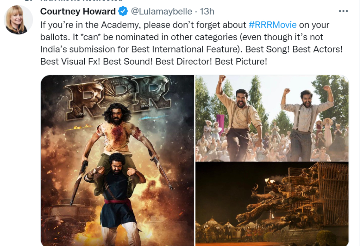 आरआरआर को कई इंटरनेशनल अवॉर्ड मिल चुके हैं और फिल्म लगाचार चर्चाओं के केंद्र में है। गोल्डन ग्लोब के अलावा न्यूयॉर्क क्रिटिक्स च्वाइस अवॉर्ड भी लिस्ट में शामिल है। ऑस्कर अवॉर्ड्स की ओरिजिनल सॉन्ग कैटेगरी में फिल्म शॉर्ट लिस्ट हो चुकी है। 24 तारीख को नॉमिनेशंस की घोषणा की जानी है।