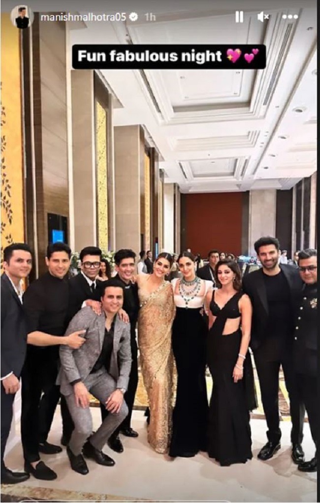 एक तस्वीर में आदित्य राय कपूर को अपनी रुमर्ड गर्लफ्रेंड अनन्या पांडे के साथ देखा जा सकता है। मनीष मल्होत्रा ने सोमवार को एक तस्वीर शेयर की है। इसमें उन्हें आदित्य राय कपूर और अनन्या पांडे के साथ बोल्ड पोज देते हुए देखा जा सकता है। तस्वीरों में उनके अलावा और भी कई लोग हैं। इनमें करण जौहर, सिद्धार्थ मल्होत्रा, कृति सेनन और कियारा आडवाणी शामिल है। तस्वीरें शेयर करते हुए उन्होंने लिखा है, 'मस्त फैबुलस नाइट।' इस रिसेप्शन में करीना कपूर, आलिया भट्ट, रणवीर सिंह, नीतू कपूर, काजोल, अजय देवगन जैसे कई कलाकारों ने भाग लिया था।