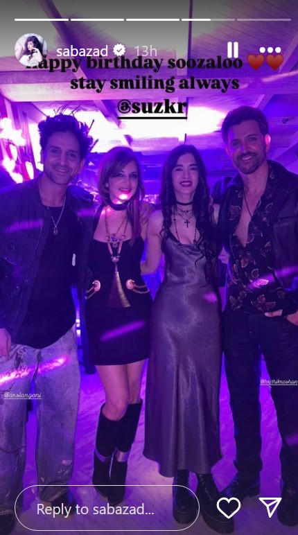 सबा ने एक तस्वीर शेयर की, जिसमें उनके साथ ऋतिक रोशन (Hrithik Roshan) नजर आ रहे हैं। साथ ही सुजैन खान और अर्सलान गोनी भी हैं। सभी के चेहरे पर स्माइल है। यह सुजैन के पिछले बर्थ डे की फोटो है। इसे री शेयर करते हुए सबा ने लिखा, 'हैप्पी बर्थ डे सुजालो...हमेशा हंसती रहो।'