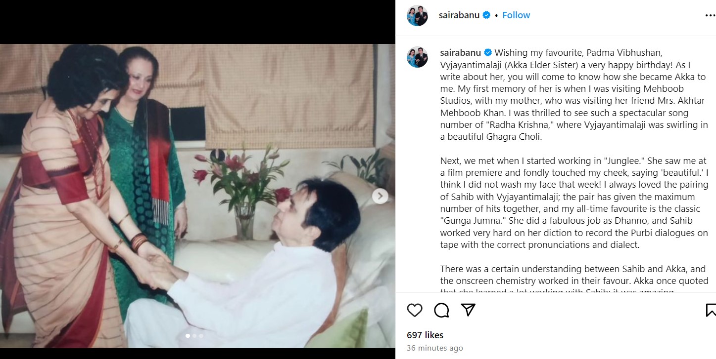 एक्ट्रेस ने कुछ तस्वीरों को शेयर करते हुए लिखा, ''मेरी पसंदीदा और पद्म विभूषण विजेता वैजयंतीमाला (मेरी बड़ी बहन समान) को जन्मदिन की ढेर सारी बधाई। मैं उनके बारे में जो लिख रही हूं, उससे आपको पता लगेगा मैं उन्हें अक्का क्यों कहती थी। मैं उनसे पहली बार महबूब स्टूडियो में मिली थी, जब मैं अपनी मां के साथ वहां गई थी। मैं राधा कृष्णा गाने के लिए घाघरा चोली पहनकर तैयार हुईं वैजयंतीमाला को देखकर हैरान थी।''