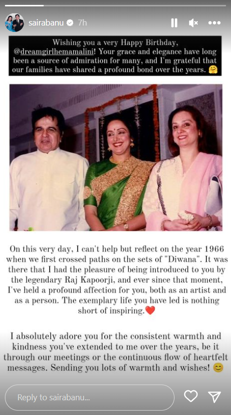 जुलाई में सायरा बानो ने इंस्टाग्राम पर अपना डेब्यू किया था। जुलाई से लेकर अक्टूबर तक वह कई पोस्ट शेयर कर चुकी हैं। अब हेमा मालिनी संग एक पुरानी तस्वीर साझा की है, जिसमें हेमा और दिलीप कुमार नजर आ रहे हैं। तीनों कैमरे में पोज दे रहे हैं। कैप्शन में लिखा, आपको जन्म की बहुत-बहुत शुभकामनाएं @dreamgirlhemamalini! आपकी कृपा और खूबसूरती लंबे समय से कई लोगों के लिए प्रशंसा का स्रोत रही है और मैं आभारी हूं कि हमारे परिवारों ने सालों से एक गहरा बंधन साझा किया है।