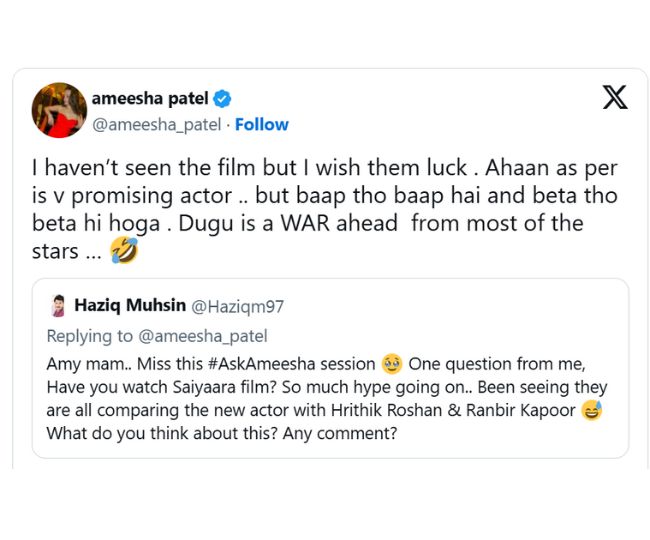 हाल ही में अमीषा पटेल ने अपने ऑफिशियल एक्स हैंडल पर आस्क मी सेशन रखा। इस दौरान एक यूजर ने उनसे सैयारा स्टार अहान पांडे की तुलना ऋतिक रोशन और रणबीर कपूर से होने के मामले को लेकर सवाल पूछा, जिसके जवाब में अमीषा ने बड़ा बयान दिया और कहा-