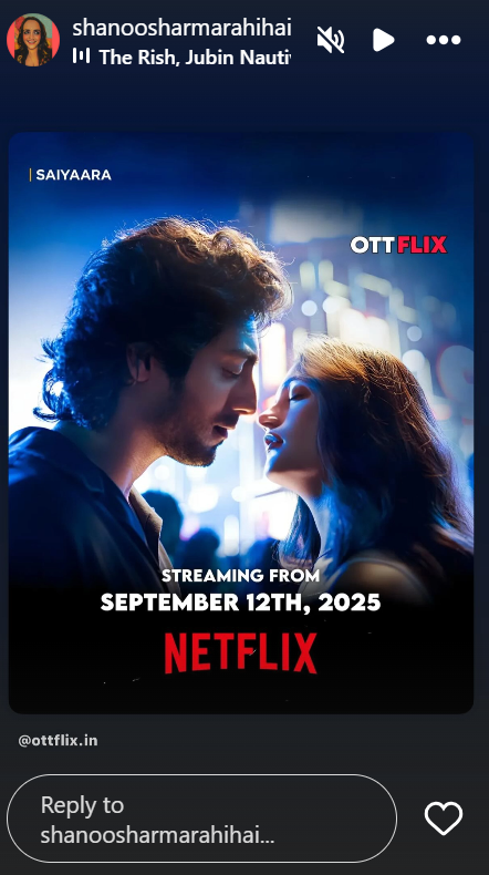 मेकर्स ने सैयारा के ओटीटी पर रिलीज होने की ऑफिशियल अनाउंसमेंट तो नहीं की है लेकिन कास्टिंग डायरेक्टर शानू शर्मा ने अपनी इंस्टाग्राम स्टोरी पर इसकी ओटीटी रिलीज की पुष्टि की है। उन्होंने OTTFLIX एक पोस्ट को अपनी स्टोरी पर शेयर किया है जिसमें लिखा है कि सैयारा 12 सितंबर, 2025 को नेटफ्लिक्स पर स्ट्रीम होगी। शानू शर्मा ने इसे अपने सोशल मीडिया पर शेयर किया है जिससे हिंट मिलती है सैयारा अगले महीने नेटफ्लिक्स पर रिलीज होगी।