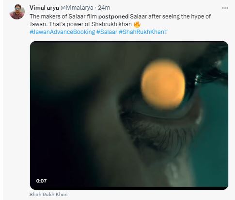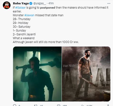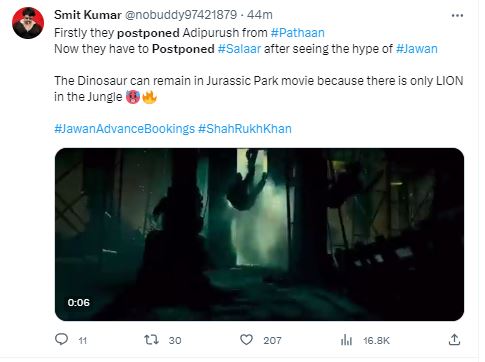 दूसरे यूजर ने लिखा, "पहले उन्होंने पठान की वजह से आदिपुरुष टाली, अब जवान के हाइप को देखते हुए उन्होंने सालार पोस्टपोन कर दी। डायनासोर जुरासिक पार्क में रह सकते हैं, लेकिन जंगल का राजा सिर्फ शेर है"।