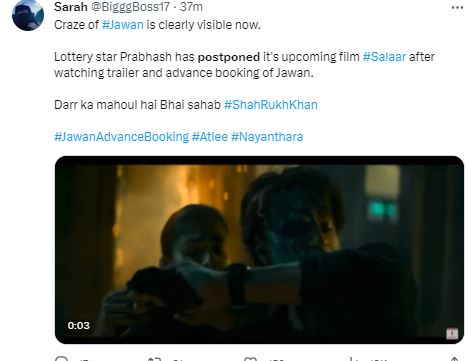 सोशल मीडिया पर यूजर्स का कहना है कि 'सालार' के मेकर्स 'जवान' के हाइप को देखते हुए 'सालार' की डेट को आगे बढ़ा रहे हैं। एक यूजर ने ट्विटर पर लिखा, "जवान का क्रेज लोगों में साफ तौर पर देखने को मिल रहा है। जवान के ट्रेलर और एडवांस बुकिंग को देखने के बाद लॉटरी स्टार प्रभास की फिल्म 'सालार' टल गई है, डर का माहौल है भाई साहब"।