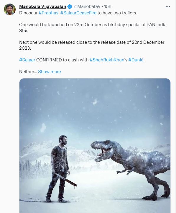 हाल ही में फिल्म क्रिटिक मनोबाला विजय बालन ने अपने ऑफिशियल ट्विटर अकाउंट पर जानकारी शेयर करते हुए बताया कि डायनासोर प्रभास की 'सालार' के एक नहीं, बल्कि दो अलग-अलग ट्रेलर रिलीज होने वाले हैं। सालार का पहला ट्रेलर 23 अक्टूबर को प्रभास के जन्मदिन के खास मौके पर रिलीज किया जाएगा।