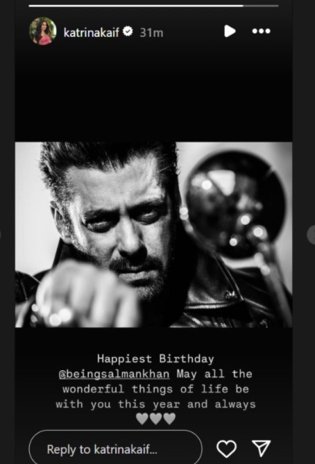 अब कटरीना कैफ ने इंस्टा पर एक स्पेशल पोस्ट करते हुए एक्टर तक अपनी विशेज पहुंचाईं। उन्होंने सलमान की एक ब्लैक एंड व्हाइट फोटो शेयर करते हुए लिखा- 'हैप्पी बर्थडे सलमान खान। मैं दुआ करती हूं कि इस साल आपके पास सारी खूबसूरत चीजें हो और वो हमेशा आपके साथ ही रहें।'