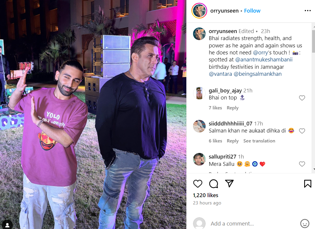 अनंत अंबानी की बर्थडे पार्टी में सलमान खान ने सिंगर बीप्राक के साथ मिलकर कितना धमाल मचाया है, इसकी कई झलकियां हम वायरल वीडियोज में पहले ही देख चुके हैं। हालांकि, अब ओरी और सलमान खान की एक तस्वीर वायरल हो रही है, जिसमें हमेशा की तरह ओरी मस्ती के मूड में दिखाई दे रहे हैं, लेकिन उनके पास में खड़े बॉलीवुड के दबंग सलमान खान उनकी तरफ देख भी नहीं रहे हैं।
