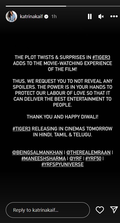 उन्होंने सोशल मीडिया पर पोस्ट किया, 'टाइगर 3 में जो जबरदस्त ट्विस्टर टर्न्स हैं, वह फिल्म देखने के एक्सपीरियंस को और एक्साइटेड करता है। हम आपसे रिक्वेस्ट करते हैं कि कोई भी स्पॉयलर न दें। हमारी मेहनत को प्रोटेक्ट करना आपके हाथ में है ताकि हम लोगों को इंटरटेन कर सकें। धन्यवाद और शुभ दिवाली।'
