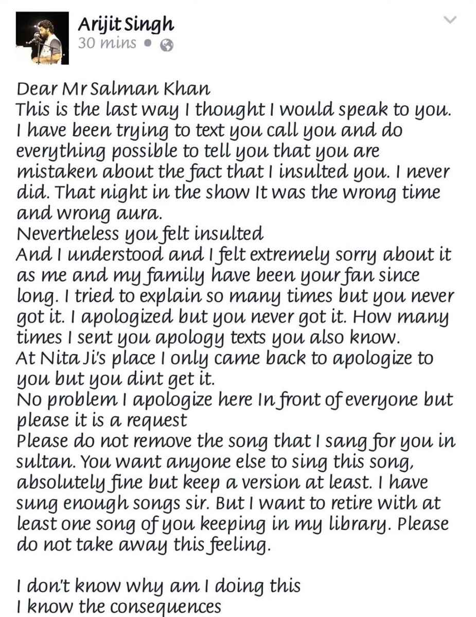 अरिजीत ने लिखा, 'मैं आपको कॉल और मैसेज सब ट्राई कर चुका हूं और हर मुमकिन चीज बताने की कोशिश कर चुका हूं कि आपने गलत ले लिया है कि मैंने आपकी बेइजती की है। मैंने ऐसा कभी नहीं किया।