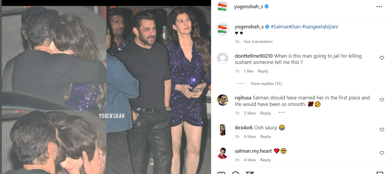 पार्टी में अपने पुराने प्यार को देख सलमान ने संगीता बिजलानी को माथे पर किस किया और गले लगा लिया। पुराने कपल का ये मूवमेंट मीडिया के कैमरों में कैद हो गया। सोशल मीडिया पर दोनों की तस्वीर और वीडियो तेजी से वायरल हो रही है। इस दौरान एक्ट्रेस ब्लू शिमर ड्रेस में बेहद खूबसूरत लग रही थी।