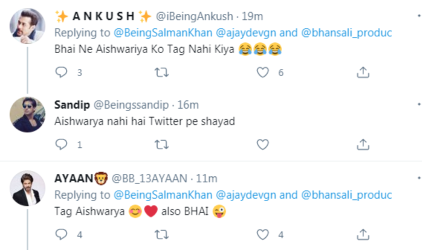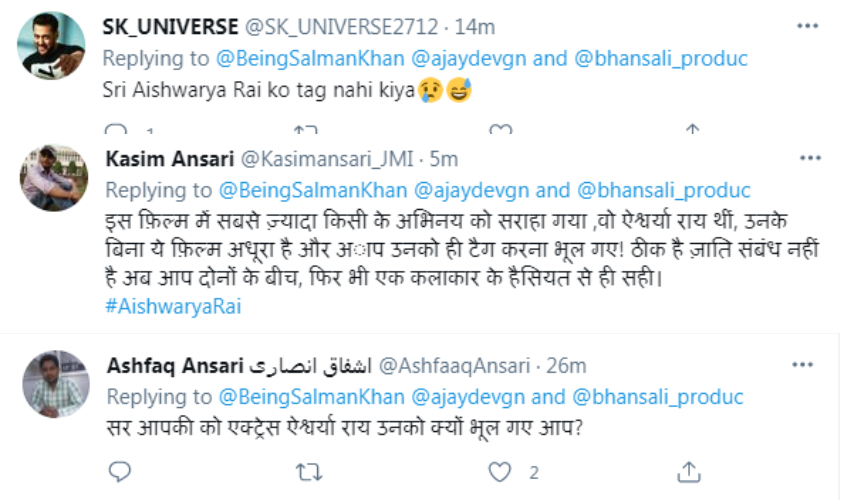 सलमान के ट्वीट में ऐश्वर्या राय बच्चन का नाम मिसिंग देख कई फैंस ने उन्हें ट्वीट करके इस बारे में पूछा। एक फैन ने लिखा कि ऐश्वर्या के अभिनय को फ़िल्म में सबसे अधिक सराहा गया था। आप उनका ही नाम भूल गये। फैंस और फॉलोअर्स के ये ट्वीट आप नीचे देख सकते हैं।