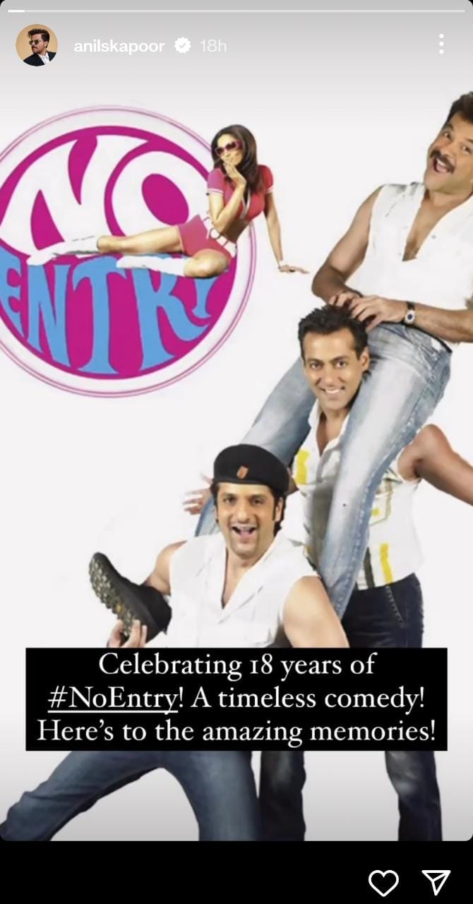 अनिल कपूर और लारा दत्ता ने 'नो एंट्री' में पति-पत्नी का किरदार अदा किया था। इस बीच अब जब इस मूवी की रिलीज को 18 साल का लंबा वक्त पूरा हो गया है, उनकी तरफ से प्रतिक्रिया आनी तो बनती है। इस खास मौके पर अनिल कपूर ने अपने ऑफिशियल इंस्टाग्राम हैंडल पर स्टोरी में फिल्म के पोस्टर शेयर करते हुए लिखा है कि- ''नो एंट्री के 18 साल पूरे होने का जश्न, एक सदाबहार कॉमेडी, जिससे जुड़ी कई अद्भुत यादें मौजूद हैं।''