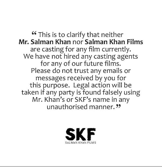 हमने भविष्य में बनने वाली किसी भी कास्टिंग एजेंट को हायर नहीं किया है। अगर आपको इससे जुड़ा कोई भी मेल या मैसेज आए, तो उस पर विश्वास नहीं कीजियेगा। अगर कहीं भी मिस्टर खान या SKF फिल्म्स का गलत तरह से नाम का इस्तेमाल किया जाएगा, तो उनके खिलाफ लीगल एक्शन लिया जाएगा"।