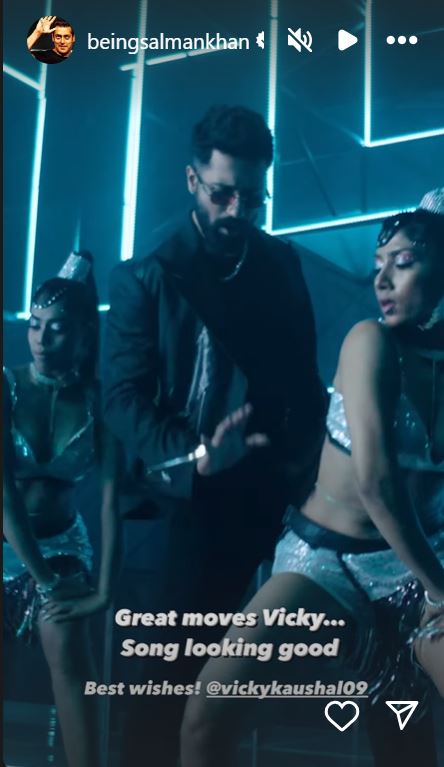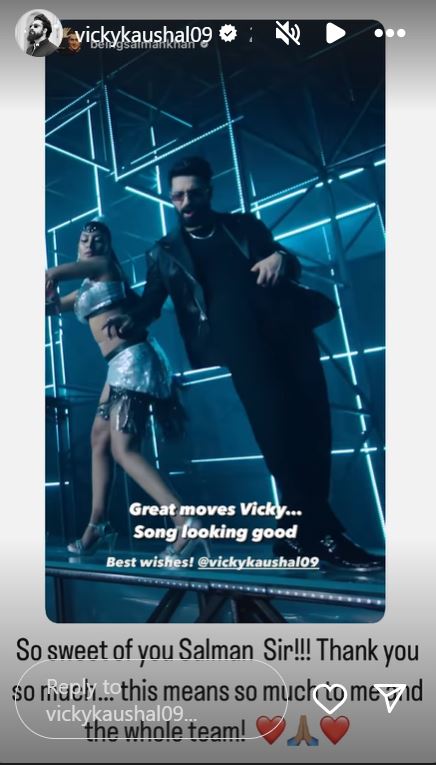सलमान खान ने विक्की कौशल के डांस मूव्स को पसंद किया है। उन्होंने अभिनेता के डांस का वीडियो इंस्टाग्राम स्टोरी पर शेयर किया है और उनकी तारीफ में कहा, "बढ़िया मूव्स विक्की। सॉन्ग शानदार लग रहा है। बहुत-बहुत शुभकामनाएं विक्की कौशल।"