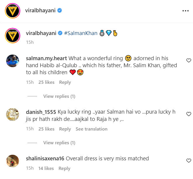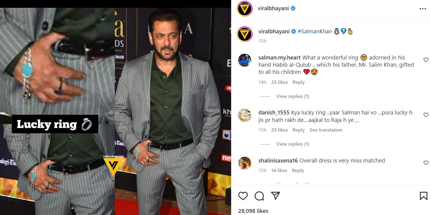 इस फोटो को विरल भयानी ने अपने इंस्टाग्राम पर शेयर किया है, जिसमे उन्होंने लिखा है- लकी रिंग। इस पोस्ट पर यूजर्स मजेदार कमेंट्स कर रहे हैं। एक यूजर ने लिखा- सलमान खान तो पूरे ही लकी हैं, उन्हें क्या किसी लकी चीज को पहनने की जरूरत है। दूसरे ने लिखा- ये जरूर बंगाली बाबा ने दी होगी, इसे इसका खोया हुआ प्यार वापस पाने के लिए। एक ने लिखा- सलमान भाई ने कहीं अपनी सगाई तो नहीं कर ली। वहीं, कुछ लोगों का कहना है कि ये रिंग सलमान को पिता सलीम खान ने दी है, जैसा कि उन्होंने अपने सभी बच्चों को दी हुई है। हालांकि अब इस रिंग का क्या सच है ये तो सलमान खान ही जानते हैं।