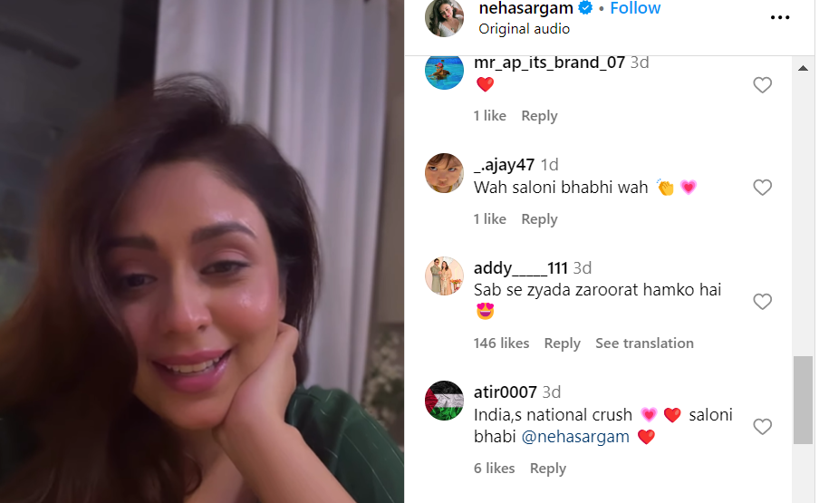 एक और अन्य यूजर ने लिखा, "इंडिया की नेशनल क्रश सलोनी भाभी ही हैं"। उनकी एक स्कूल फ्रेंड ने भी नेहा के वीडियो पर कमेंट करते हुए लिखा कि बचपन से अब तक उनकी आवाज में कोई बदलाव नहीं आया है।