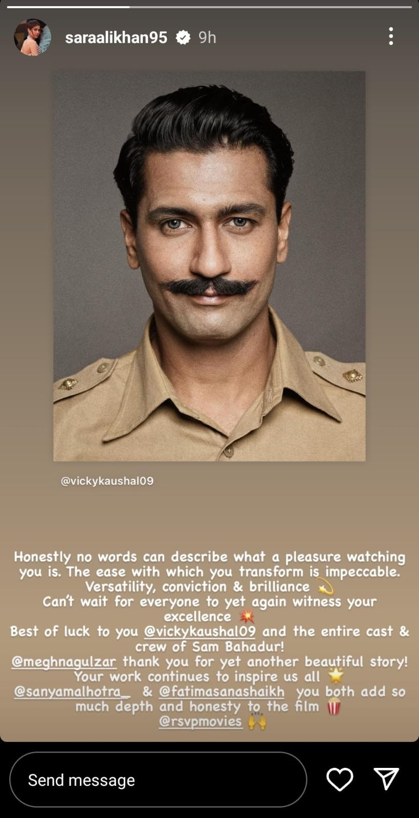 इतना ही नहीं सारा अली खान जैसे अन्य बॉलीवुड सेलेब्स के दिलों को भी 'सैम बहादुर' ने जीत लिया है और उन्होंने सोशल मीडिया पर इस मूवी की तारीफ की है।