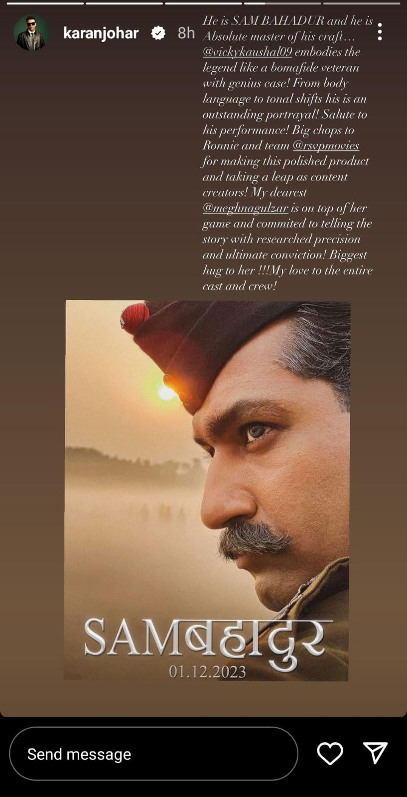 करण जौहर ने अपने इंस्टाग्राम हैंडल पर स्टोरी में लिखा है- ''वह सैम बहादुर है और वह अपने टैलेंट में पूरी तरह से निपुण है। विक्की कौशल आप कितने प्रतिभाशाली हैं, इसे फिर से आपने साबित कर दिया है।