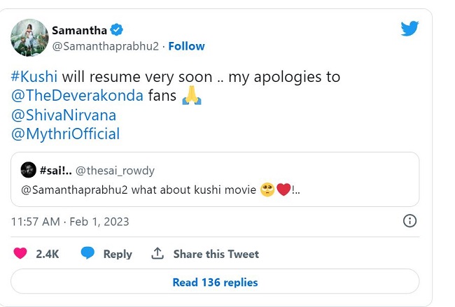 समांथा रुथ प्रभु ने ट्विटर पर प्रतिक्रिया देते हुए लिखा है, 'खुशी की शूटिंग जल्द शुरू होगी। विजय देवरकोंडा के फैंस से मैं क्षमा चाहती हूं। यशोदा फिल्म में नजर आई समांथा रुथ प्रभु ने विजय देवरकोंडा से भी डिले के लिए माफी मांगी है। इसके पहले ट्विटर पर एक फैन ने लिखा था, 'समांथा रुथ प्रभु खुशी फिल्म पर क्या हो रहा है?' इसी पर उन्होंने प्रतिक्रिया देते हुए यह बातें कही है।