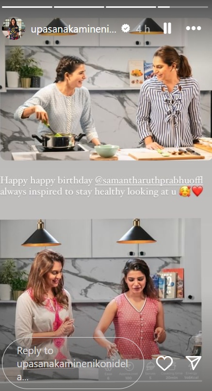 साउथ सुपरस्टार राम चरण की पत्नी उपासना कोनिडेला ने भी एक्ट्रेस को जन्मदिन की बधाई दी है। बता दें कि सामंथा और उपासना बहुत अच्छी दोस्त हैं। उपासना ने अपनी इंस्टाग्राम स्टोरी के सेक्शन में एक पुरानी तस्वीर शेयर की है, जिसमें दोनों किचन में काम करते हुए दिखाई दे रही हैं। इस फोटो को शेयर करते हुए उन्होंने लिखा कि जन्मदिन मुबारक हो सामंथा रुथ प्रभु, आपको देखकर हमेशा स्वस्थ रहने के लिए प्रेरित होती हूं।