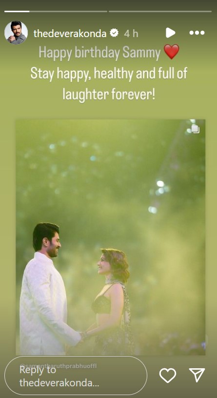 विजय देवरकोंडा ने अपने सोशल मीडिया हैंडल इंस्टाग्राम की स्टोरी पर कुशी मूवी की को-स्टार रहीं सामंथा रुथ प्रभु के साथ एक फोटो शेयर करते हुए उन्हें जन्मदिन की बधाई दी है। इस फोटो को शेयर करते हुए उन्होंने कैप्शन में लिखा कि जन्मदिन मुबारक हो सैमी। हमेशा खुश, स्वस्थ और हंसी से भरपूर रहें। विजय के इस पोस्ट का सामंथा ने भी जवाब दिया और लिखा कि बहुत बहुत धन्यवाद वी।