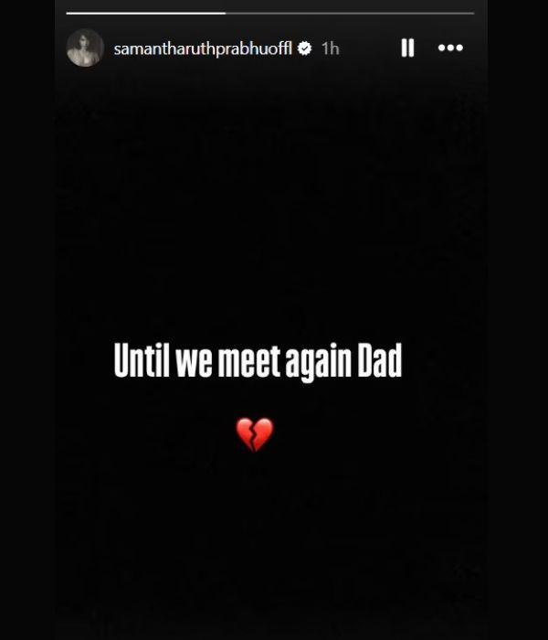 सामंथा रुथ प्रभु ने इंस्टाग्राम स्टोरी के जरिए फैंस को एक बुरी खबर दी है। इस नोट में उन्होंने लिखा है कि 'अब जब तक हम दोबारा नहीं मिलते, पापा...' इसके साथ उन्होंने एक टूटे हुए दिल की इमोजी लगाई। सोशल मीडिया पर एक्ट्रेस की यह पोस्ट तेजी से वायरल हो रही हैं। जिसे देखने के बाद हर कोई उनके दुख के प्रति सांत्वना दिखाता नजर आ रहा है।