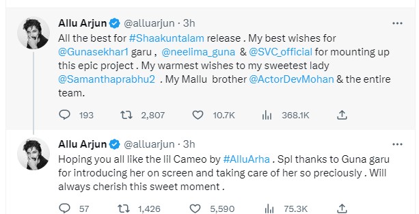 'शाकुंतलम' में 'अल्लू अर्जुन की बेटी अल्लू अरहा ने भी अभिनय किया है। ऐसे में 'पुष्पा' स्टार ने पूरी टीम को विश करते हुए दर्शकों से उनकी बेटी के अभिनय को सराहे जाने की अपील की है। अल्लू अर्जुन ने ट्वीट किया, '#Shaakuntalam की रिलीज के लिए बधाई। @Gunashekhar1 @neelima_guna @SVC_official को मेरी तरफ से बेस्ट विशेज। स्वीटेस्ट लेडी @Samanthaprabhu2 को भी बधाई। @ActorDevNohan और पूरी टीम को बधाई।'