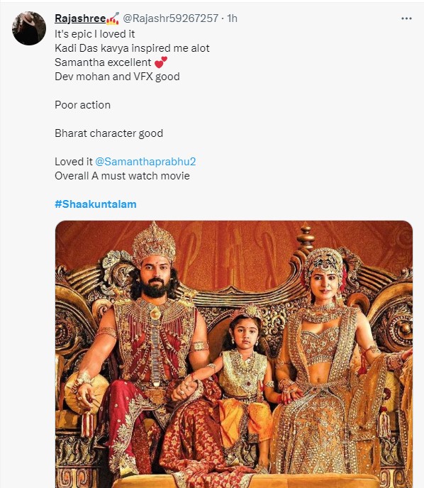 एक अन्य यूजर ने फिल्म की कहानी के साथ ही सामंथा रुथ प्रभु की एंट्री की भी तारीफ की। उन्होंने लिखा, 'सामंथा रुथ प्रभु को महल के सीन के लिए स्टैंडिंग ओवेशन मिलना चाहिए। मैंने कभी नहीं सोचा था कि #Shaakuntalam में महारानी शकुंतला के रोल के किरदार को सामंथा इतनी अच्छी तरह निभाएंगी। जिस तरह से उन्होंने शकुंतला को दर्द को दिखाया, उससे मैं भावुक हो गया। सामंथा ने प्रूव किया कि वह एक्टिंग के लिए ही बनी हैं।'
