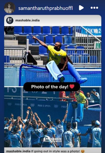सामंथा रुथ प्रभु ने किसी और का नहीं बल्कि पेरिस ओलंपिक 2024 (Paris Olympics 2024) में हॉकी टीम के कांस्य पदक जीतने का जश्न मनाया है। उन्होंने ओलंपिक में जीत के बाद भारतीय हॉकी टीम की फोटो शेयर की है। सामंथा ने टीम की एक और फोटो शेयर की है, जिस पर लिखा है, "फोटो ऑफ द डे।"