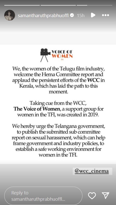 एक्ट्रेस ने सोशल मीडिया पर लिखा, ''तेलुगु फिल्म इंडस्ट्री की हम महिलाएं, हेमा कमेटी की रिपोर्ट का स्वागत करती हैं और केरल में डब्ल्यूसीसी के प्रयासों की सराहना करती हैं, जिसने इन घटनाओं के खुलासे का रास्ता बनाया। डब्ल्यूसीसी से हिंट लेकर द वॉयस ऑफ वुमेन, टीएफआई (तेलुगु फिल्म इंडस्ट्री) में महिलाओं के लिए 2019 में हेल्पलाइन ग्रुप बनाया गया था। हम तेलंगाना सरकार से यौन उत्पीड़न पर पेश की गई उप समिति की रिपोर्ट को पब्लिश करने की अपील करते हैं, जो सरकार को महिलाओं के लिए सुरक्षित माहौल बनाने और पॉलिसी लागू करने में मदद कर सकता है।