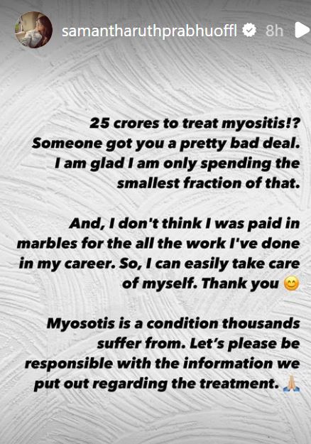 सामंथा रुथ प्रभु ने मायोसाइटिस से पीड़ित मरीजों को इलाज से जुड़ी गलत जानकारी देने पर गुस्सा जताया। उन्होंने कहा, "मायोसाइटिस एक ऐसी बीमारी है, जिससे हजारों लोग पीड़ित हैं। प्लीज इलाज से जुड़ी खबरों को देने से पहले थोड़े जिम्मेदार बनें।"