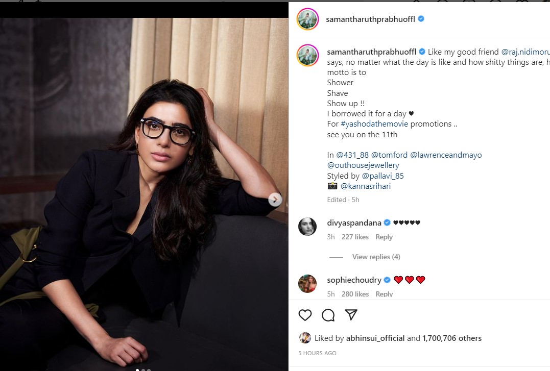 समांथा ने आगामी फिल्म 'यशोदा' के प्रमोशनल इवेंट के लिए अपनी कुछ तस्वीरें शेयर की हैं। तस्वीरों में अभिनेत्री चश्मा लगाए ब्लैक कलर का कोट पेंट पहने पोज दे रही हैं। उनके चेहरे पर बीमारी का असर दिख इन तस्वीरों पर कैप्शन देते हुए समांथा ने लिखा, 'जैसा मेरे अच्छे दोस्त राज निदिमोरू कहते हैं दिन कैसा भी हो और कैसी भी बेकार चीजें हो लेकिन उसका एक ही मोटिव रहता है, शावर, शेप, शो अप। मैंने इसे एक दिन के लिए उधार लिया था, यशोदा फिल्म के प्रमोशन के लिए। अब 11 तारीख को मिलते हैं।'