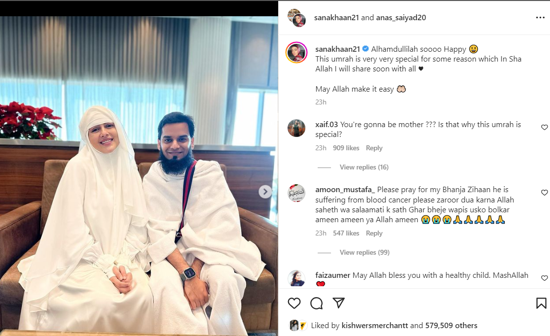 अब सना और सैय्यद के इस पोस्ट को देखने के बाद सोशल मीडिया पर यूजर्स प्रेग्नेंसी का कयास लगाते नजर आ रहे हैं। एक इंस्टा यूजर ने सना की इन फोटो पर कमेंट कर लिखा है- मुझे लगता है कि आप दोनों बहुत जल्द माता-पिता बनने वाले हैं। दूसरे यूजर ने लिखा- क्या सना प्रेग्नेंट हैं। तीसरे ने लिखा- क्या आप मां बनने जा रही हैं? क्या इसलिए ये उमरा आपके लिए खास है?