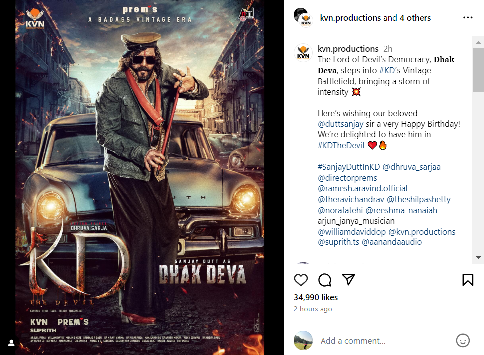 अभिनेता ने जन्मदिन के मौके पर अपने इंस्टाग्राम पर आने वाली फिल्म 'केडी'- द डेविल' की घोषणा की है और फर्स्ट लुक पोस्टर भी साझा किया। इस फिल्म में वो 'धक देवा' का किरदार निभाएंगे। एक्टर ने कैप्शन में लिखा- दैत्य लोकतंत्र के भगवान धक देवा, केडी के विटेंज युद्ध क्षेत्र में कदम रखा है और अब तूफान लाने की बारी है।