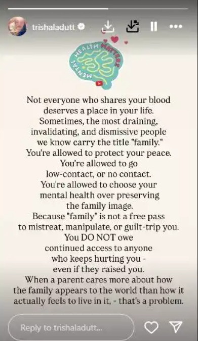 अपनी पोस्ट में त्रिशाला ने लिखा, 'आपके खून के हर रिश्ते को आपकी जिंदगी में जगह नहीं मिलनी चाहिए। कभी-कभी सबसे ज्यादा थका देने वाले लोग जिन्हें हम जानते हैं उन्हें 'परिवार' कहा जाता है। आपको अपनी शांति बनाए रखने की आजादी है। आपको कम कॉन्टैक्ट या बिल्कुल भी कॉन्टैक्ट नहीं रखने की आजादी है। आपको परिवार की इमेज बनाए रखने की बजाय अपने मेंटल हेल्थ को चुनने का अधिकार है'।