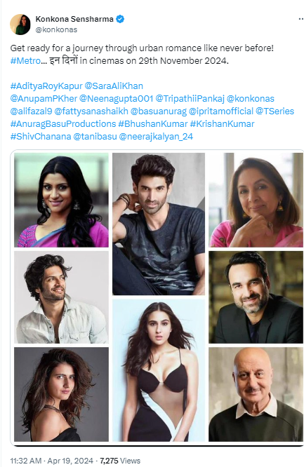 अनुराग बसु के साथ लाइफ इन अ मेट्रो के बाद, अब मेट्रो..इन दिनों में काम करने जा रहीं कोंकणा सेन शर्मा ने हाल ही में फिल्म की रिलीज डेट की जानकारी अपने फैंस को एक्स अकाउंट के माध्यम से दी। उन्होंने स्टारकास्ट की फोटो शेयर करते हुए लिखा, "तैयार हो जाइए शहरी रोमांस देखने के लिए, जो इससे पहले आपने पहले कभी नहीं देखा होगा। मेट्रो इन दिनो 29 नवंबर 2024 में रिलीज होगी।