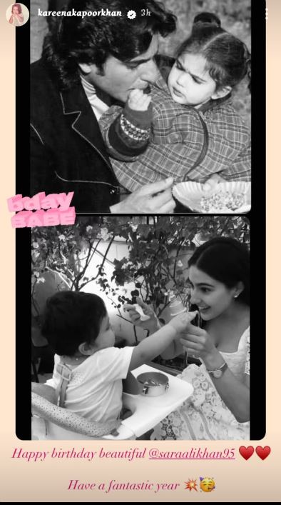 दूसरी फोटो में सारा करीना के छोटे बेटे जेह के साथ नजर आ रही हैं। इन तस्वीरों के साथ करीना ने कैप्शन में लिखा, "हैप्पी बर्थडे ब्यूटीफुल सारा अली खान। ये साल शानदार रहे।"
