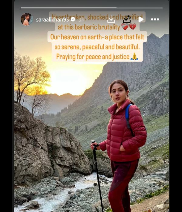 सारा अली खान ने अपनी पोस्ट शेयर करते हुए नोट में लिखा, 'इस बर्बर क्रूरता से मेरा दिल टूट गया है, मैं इस घटना के बाद स्तब्ध और भयभीत हूं।'