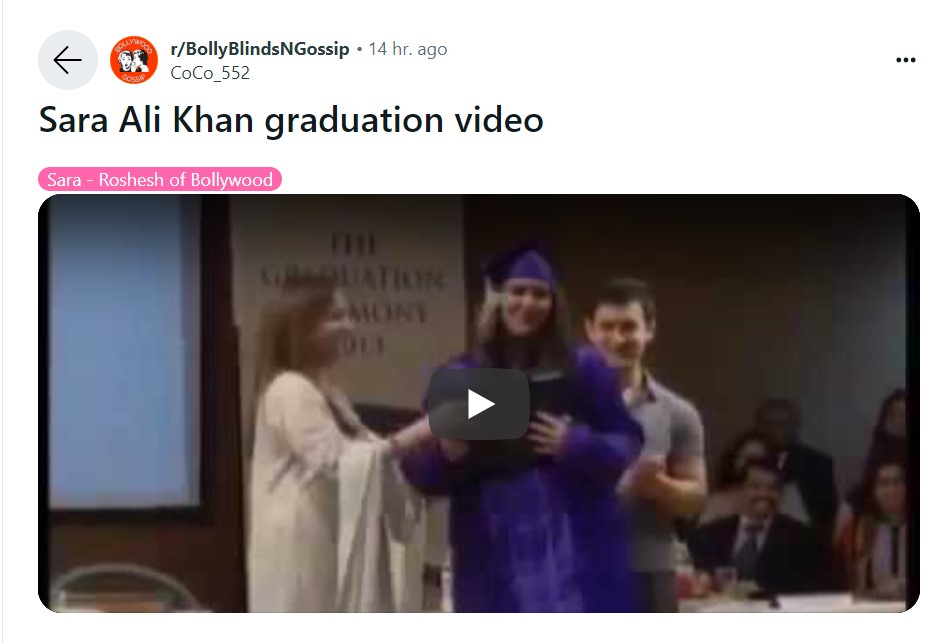 सारा अली खान, सैफ अली खान (Saif Ali Khan) और अमृता सिंह (Amrita Singh) की बेटी हैं। ग्रेजुएशन के टाइम से उनका एक वीडियो रेडिट यूजर्स की नजरों में आया है, जिसमें सारा अली खान डिग्री लेती नजर आ रही हैं। खास बात यह है कि उन्हें यह डिग्री कोई और नहीं, बल्कि नीता अंबानी (Nita Ambani) और आमिर खान (Aamir Khan) देते नजर आ रहे हैं। मगर इससे भी अलग जिस बात ने यूजर्स का ध्यान खींचा, वह है उनका नाम। डिग्री देते वक्त एक्ट्रेस को सारा अली खान न कहकर 'सारा सुल्तान' कहकर पुकारा गया।